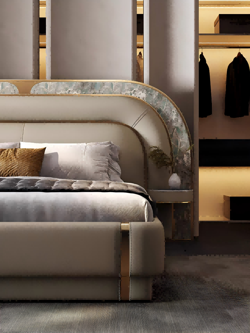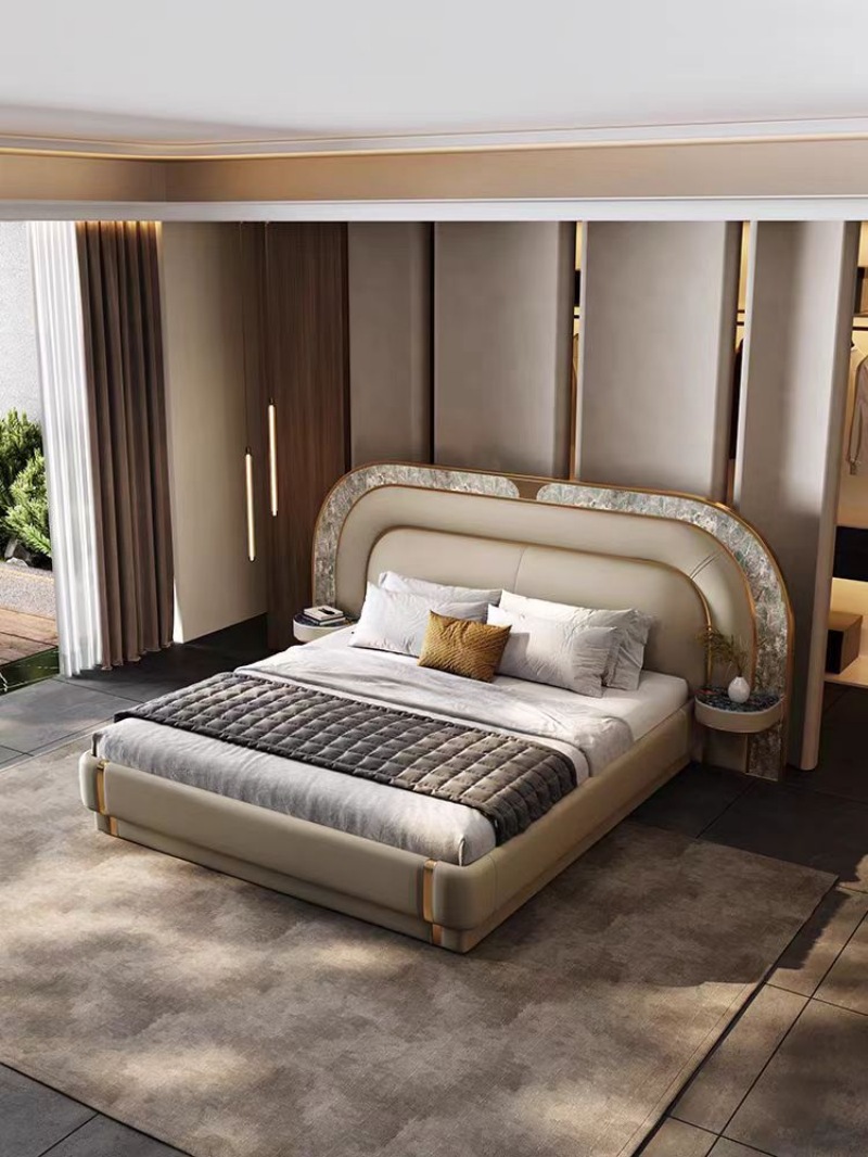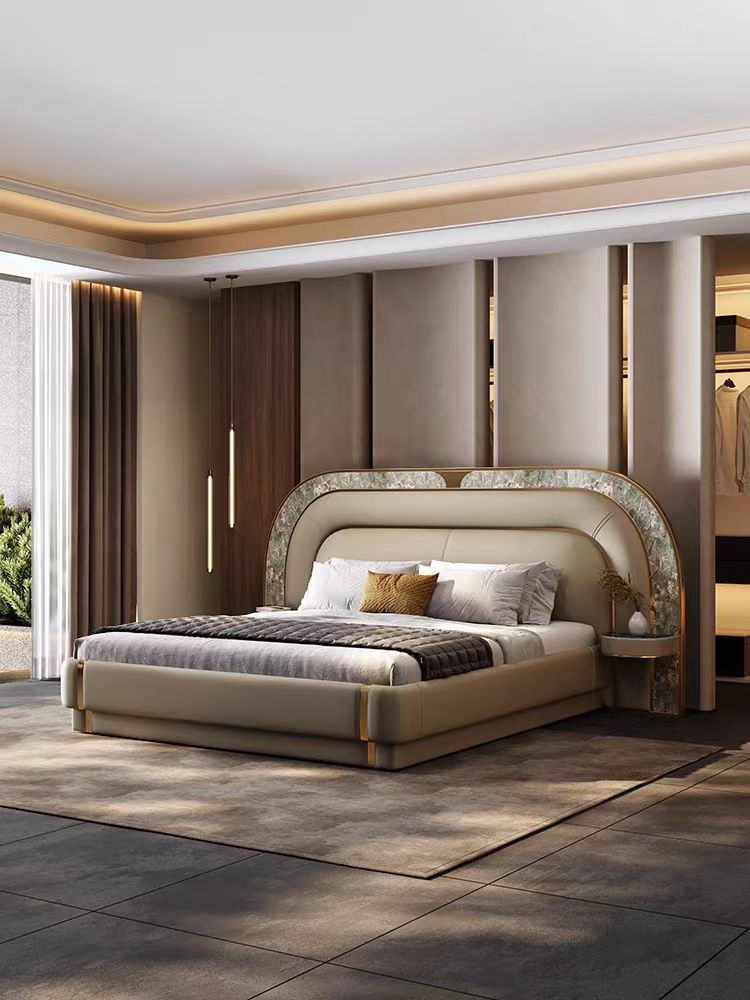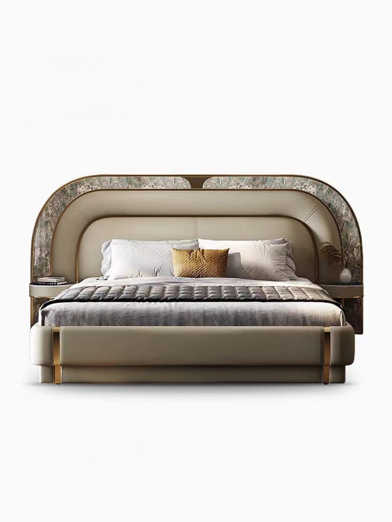 Ausgewählte italienische Carrara White Natural Marmor (3 cm eingedickt), jedes Kopfteil behält ein einzigartiges Landschaftsmuster bei, und die importierte obere Schicht-Weichverhandlungsabdeckung bildet eine Kollision von kalten und warmen Materialien. Der Marmor hat 6 Kristallisationsprozesse durchlaufen, um Penetration und Kratzen zu verhindern.