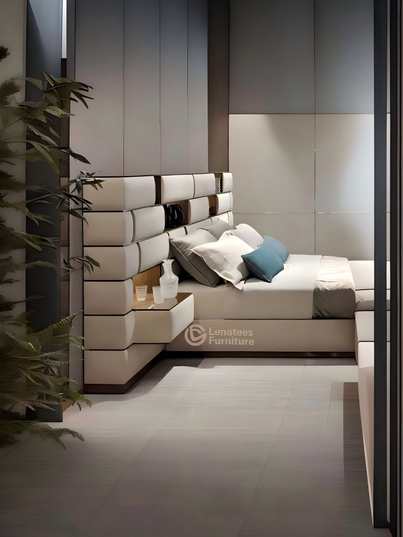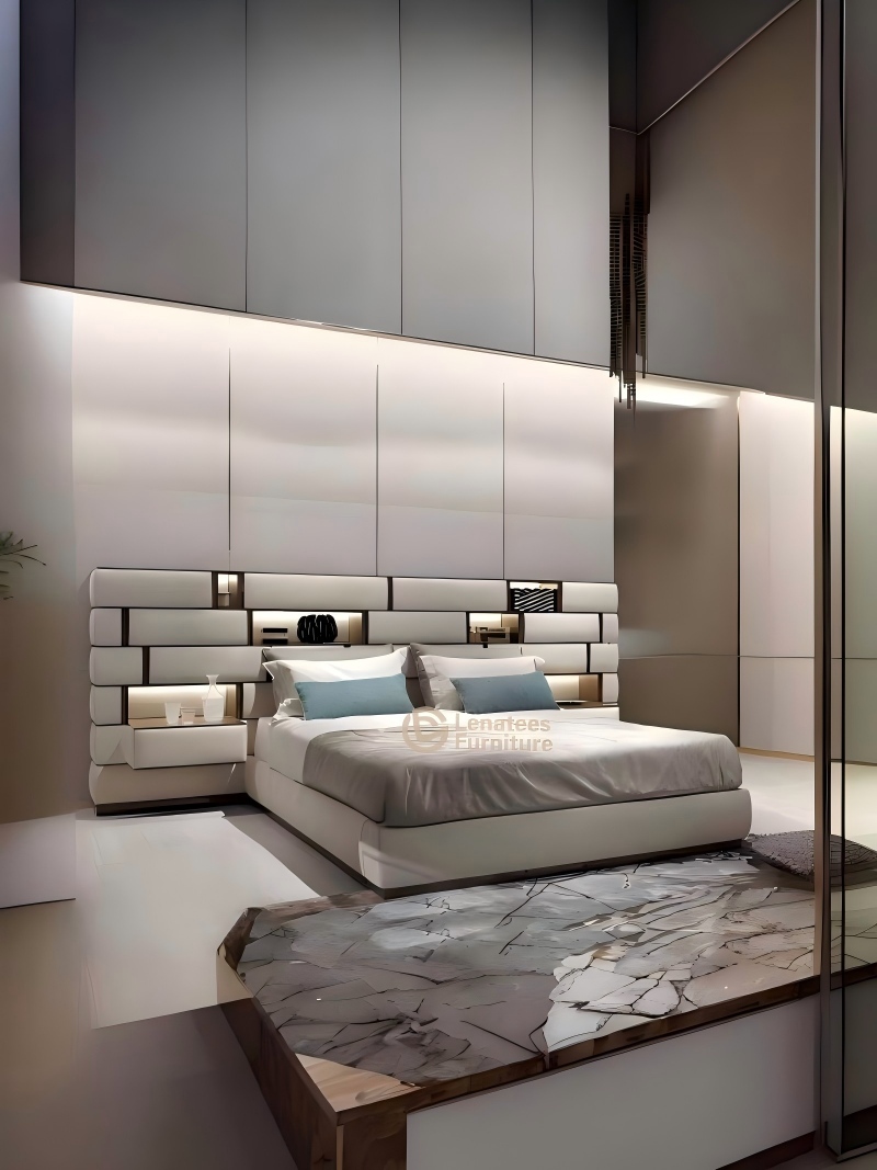Dieses Luxusbett verfügt über ein markantes Kopfteil mit raffinierten Metallakzenten – eine Mischung aus Komfort, Handwerkskunst und modernem Design.